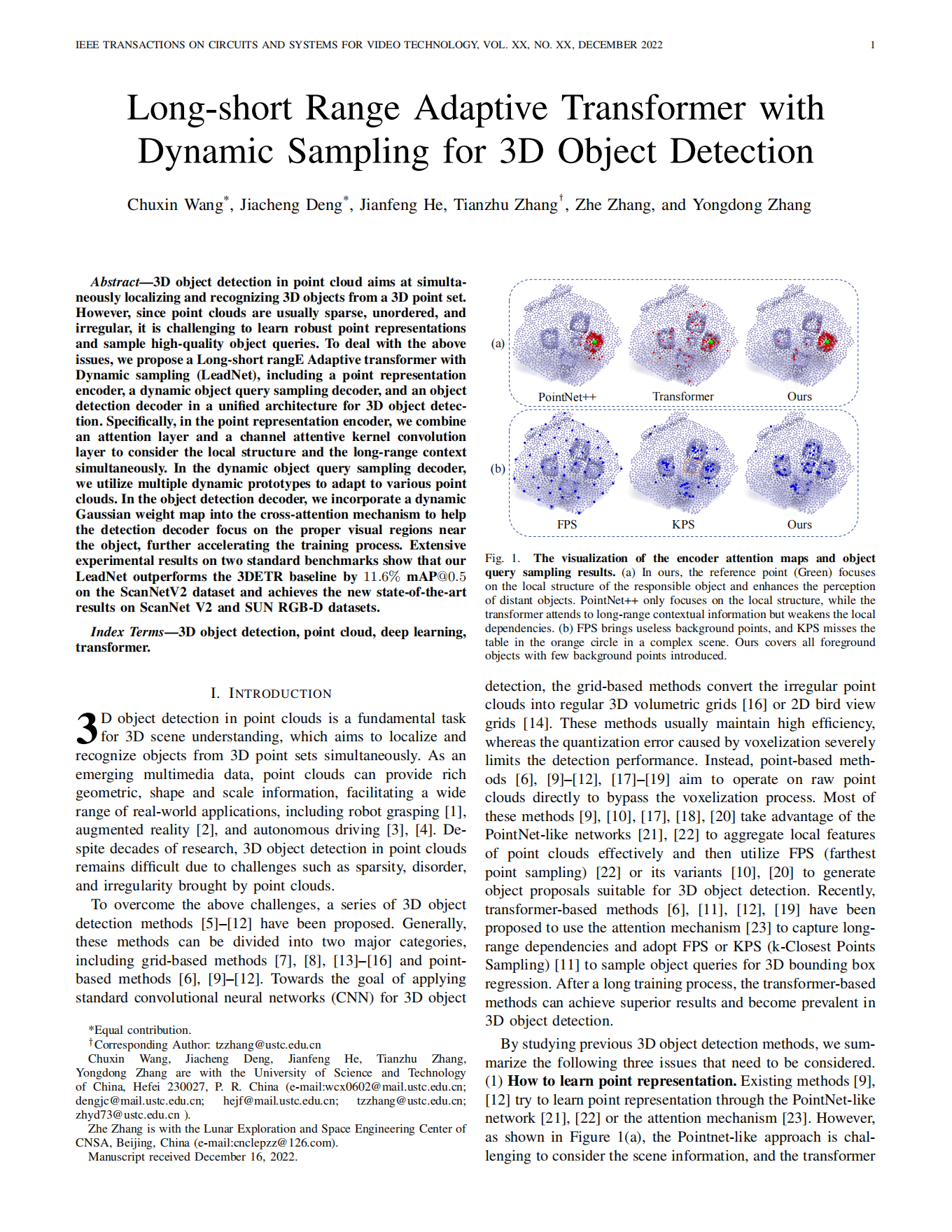 The architecture of our LeadNet consists of three major components, including the Point Representation Encoder, the Object Query Sampling Decoder, and the Object Detection Decoder.The downsampling point cloud is first obtained through the frequently-used SA module.Then the point representation encoder, composed of an attention branch and a channel-wise kernel convolution branch, extracts point representations from the downsampling point cloud.Next, and based on these point representations, the object query sampling decoder samples a certain number of qualified object queries.Finally, in the object detection decoder, these object queries aggregate features across the entire scene with the cross-attention mechanism for the subsequent object detection. For more details, please refer to the text.