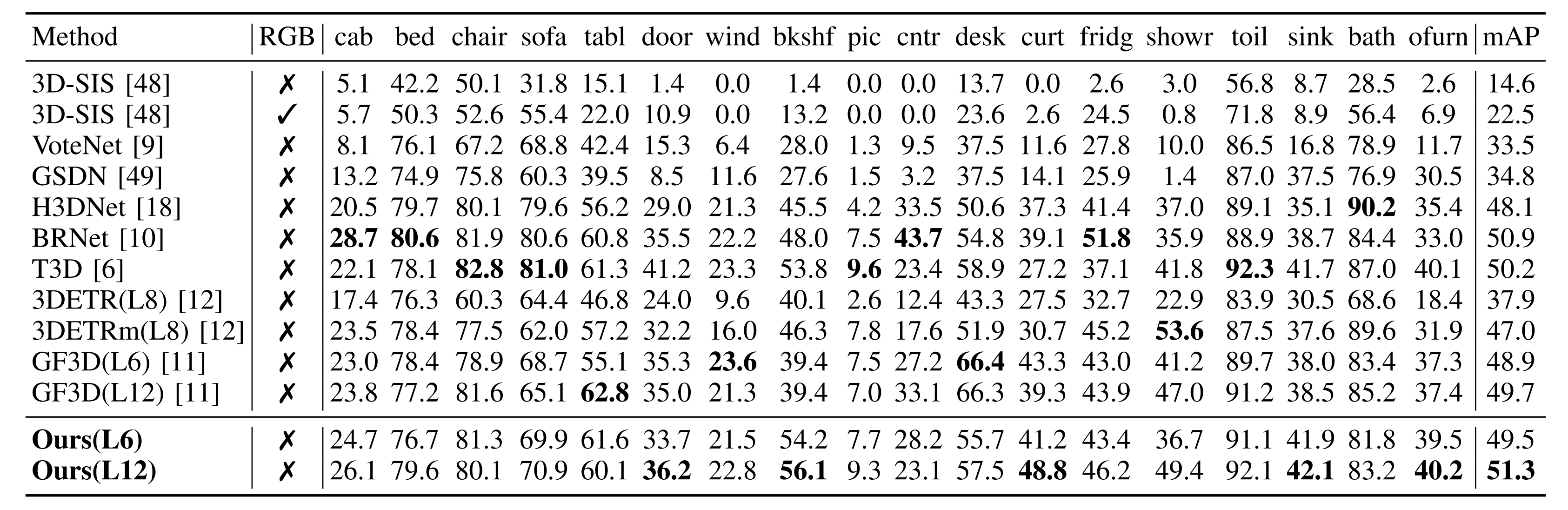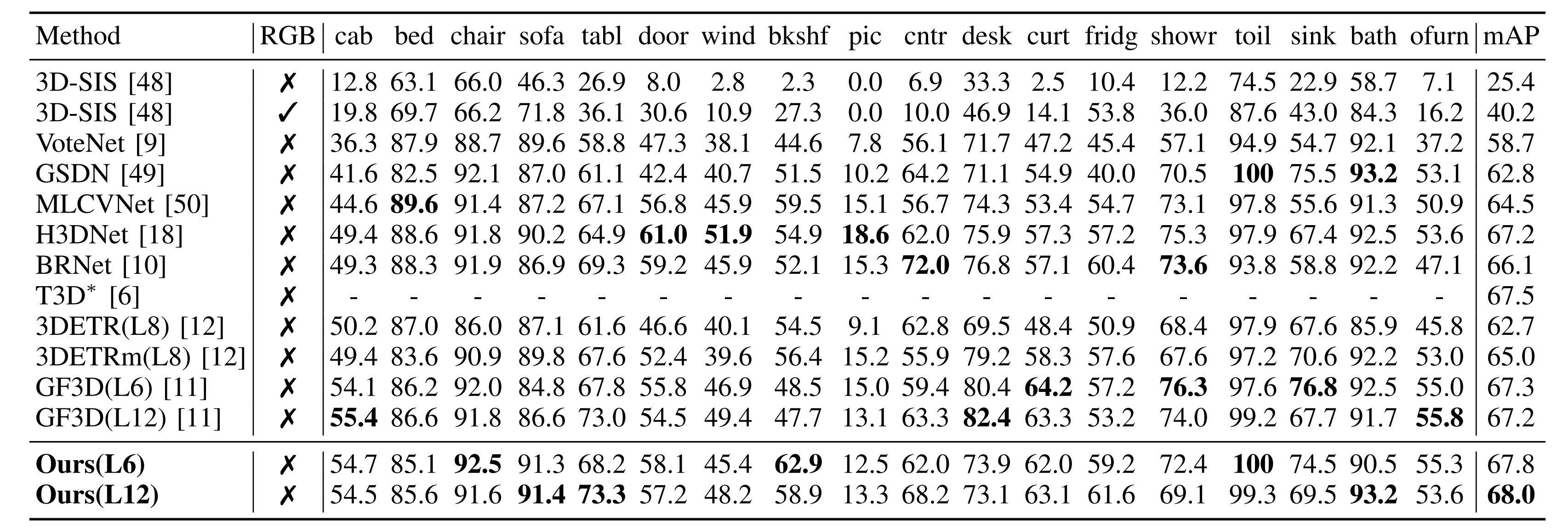 Comparison on the ScanNet V2 validation set. We show per-category results of average precision (AP) with a 3D IoU threshold of 0.25 and a mean of AP across all semantic classes. L denotes the decoder depth. Since the per-category results and checkpoints of the training model are not available, we only show the mean of AP across all semantic classes in T3D.