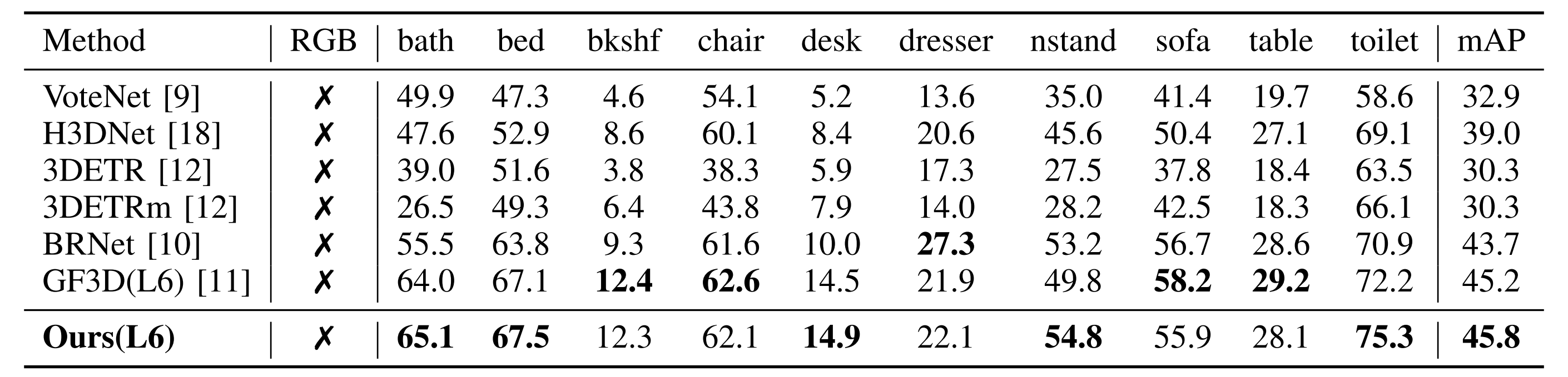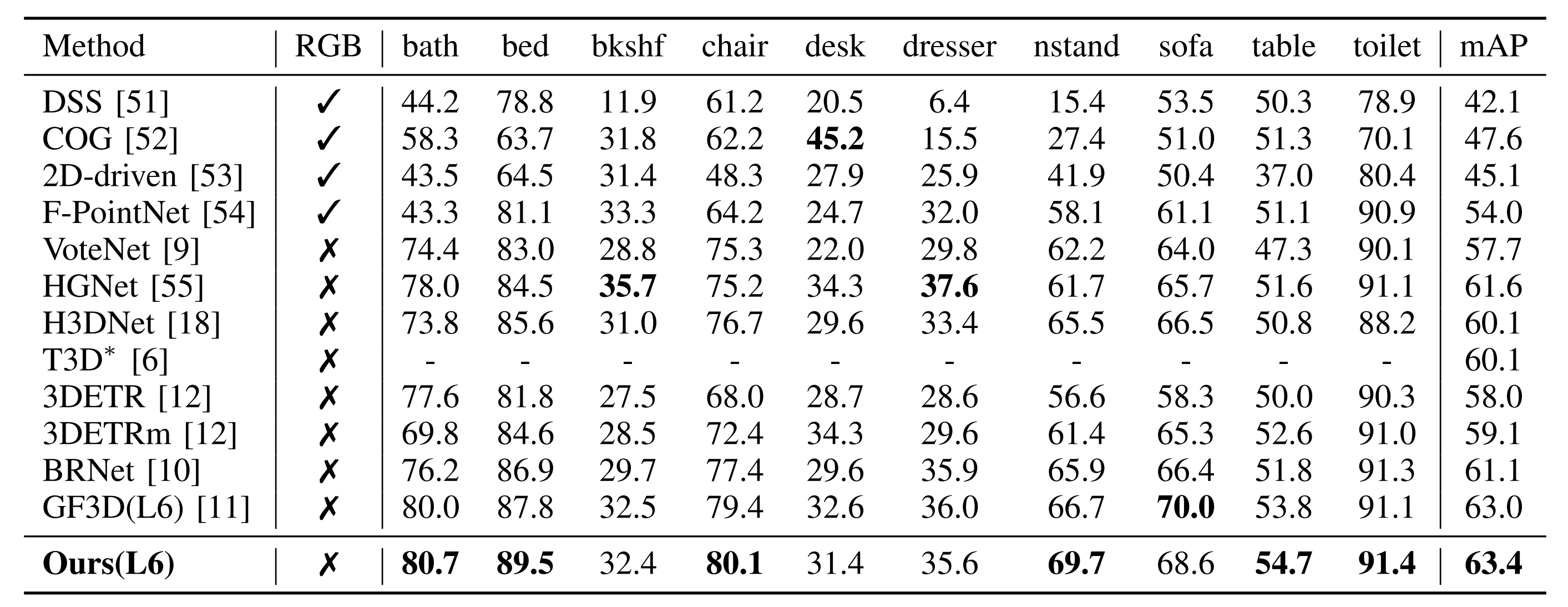 Comparison on the SUN RGB-D validation set. We show per-category results of average precision (AP) with a 3D IoU threshold of 0.25 and a mean of AP across all semantic classes. L denotes the decoder depth. Since the per-category results and checkpoints of the training model are not available, we only show the mean of AP across all semantic classes in T3D.