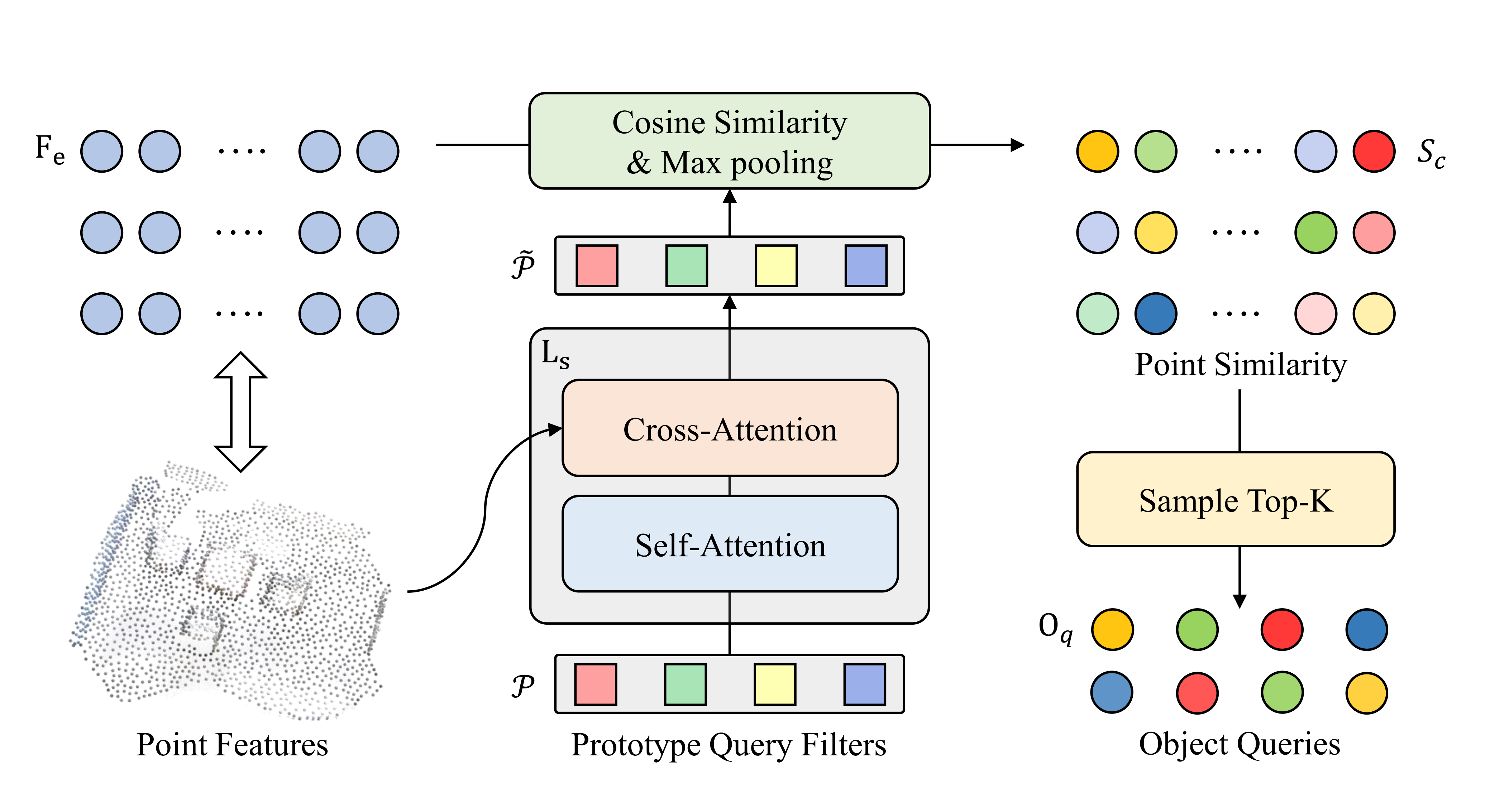 The structure of object query sampling decoder. We introduce a set of learnable prototype query filters that can dynamically adapt to the specific scene. And we calculate the cosine similarity between the points and the prototypes to sample a certain number of object queries. |